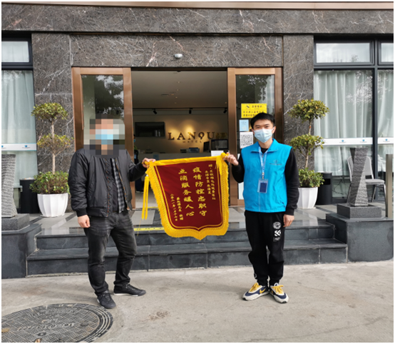 1月17日,在蘭歐維也納健康驛站解除隔離的蔡先生將一面寫有「疫情防控忠職守,點滴服務暖人心」的錦旗送到隔離點專班工作人員手中,感謝朱濠星在隔離期間對其無微不至的照顧。