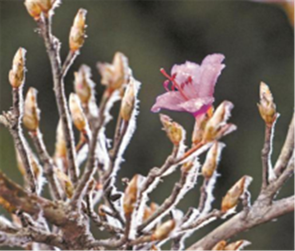 受冷空氣影響,1月8日凌晨,梧桐山氣溫驟降至-3.2℃,最大相對濕度達100%,出現了霧凇景觀。
