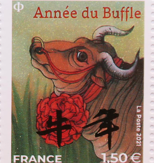 中國駐法大使盧沙野、法國郵政總裁菲利普·瓦爾等出席郵票發行儀式。當天發行的牛年生肖郵票共兩枚,面值分別為1.08歐元和1.5歐元,同時發行兩張郵票小全張,分別包含5枚郵票。郵票上印有中文「牛年」,小全張上印有中文「中國新年」。