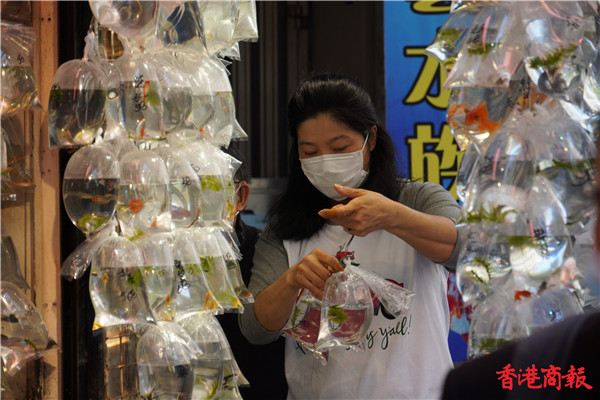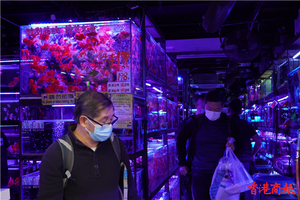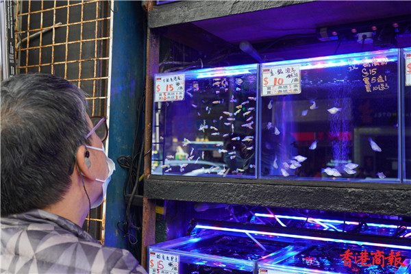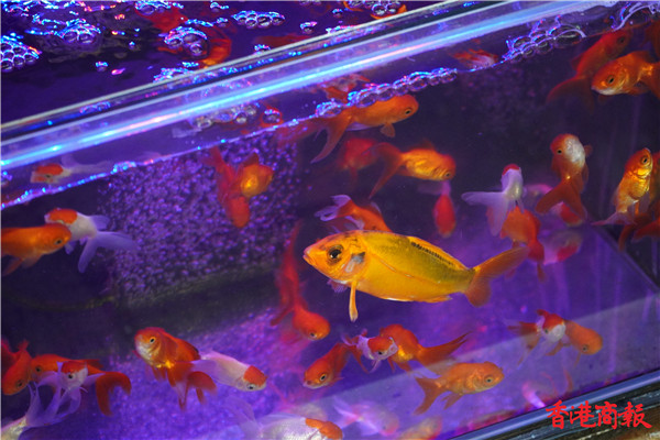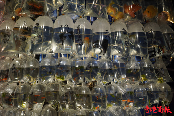 位於油尖旺區通菜街,俗稱「金魚街」的金魚市場,令人有恍如置身水族館感覺。該區開設了超過四十間,專門售賣金魚及養殖觀賞魚的水族用品專門店,吸引很多對養魚感興趣的市民到訪和購物。整條金魚街的店舖都擺放了令人目不暇給、色彩繽紛的魚,在這裏漫步實在是賞心悅目的樂事。(馮俊文攝)