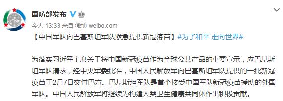 國防部新聞局官方微博「國防部發布」消息,為落實習近平主席關於將中國新冠疫苗作為全球公共產品的重要宣示,應巴基斯坦軍隊請求,經中央軍委批准,中國人民解放軍向巴基斯坦軍隊提供的一批新冠疫苗於2月7日交付巴方。巴基斯坦軍隊是首個接受中國軍隊新冠疫苗援助的外國軍隊。中國人民解放軍將繼續為構建人類衛生健康共同體作出積極貢獻。