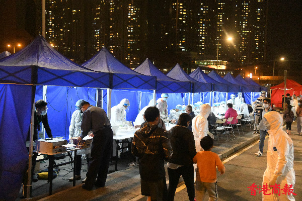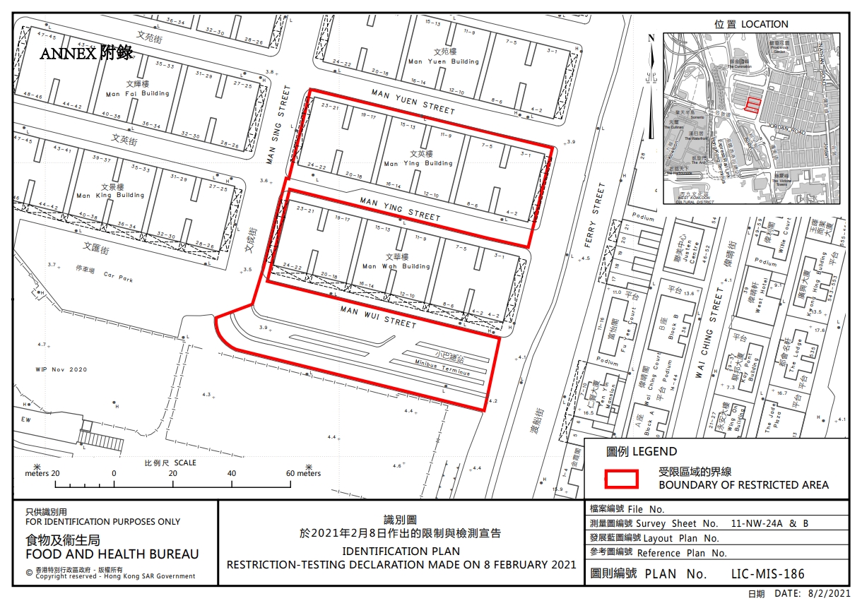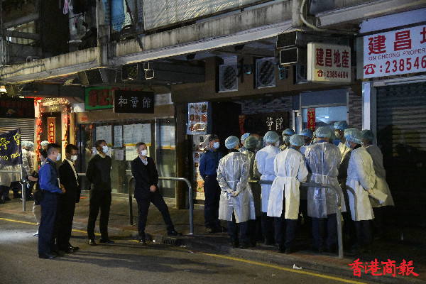 政府8日19时宣布引用《預防及控制疾病(對若干人士強制檢測)規例》(第599J章),作出限制與檢測宣告,自19时起限制在佐敦渡船角文英街2-24號文英樓內的人士須留在其處所並接受強制檢測。受檢人士須在其處所等候,直至區內所有已識別的受檢人士完成檢測,而相關檢測結果亦已獲大致確定,方可離開其處所。