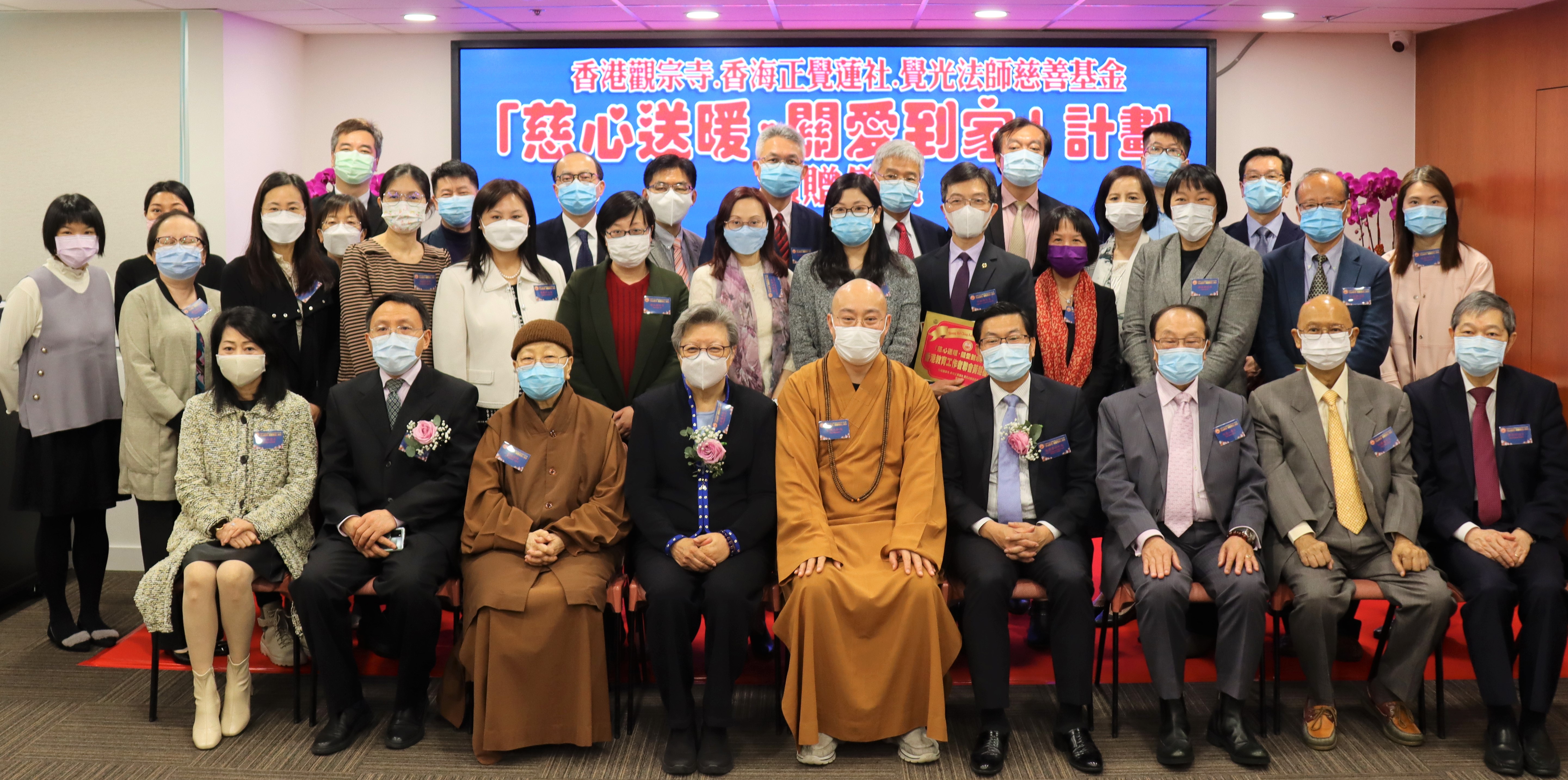 香海正覺蓮社今日(8日)上午於聯合出版大廈行政總部舉行「慈心送暖‧關愛到家」計劃頒贈儀式。典禮由勵進教育中心主席范徐麗泰、中聯辦協調部副部長陳澤濤聯合擔任主禮嘉賓。頒贈儀式在做完全做足防疫措施的前提下、在歡樂祥和的氣氛中進行。中聯辦協調部李永戰處長及香海正覺蓮社果德法師、何德心、何國榮三位副社長及法律顧問李家祥等出席儀式。