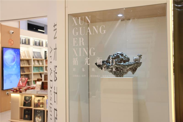 「藝術殿堂」置於藝術設計店二樓,由兩側對稱的旋轉樓梯包裹起來,匯聚了全場的視線焦點,與書城北區的「光之塔」形成對稱布局。這裏是南區最佳觀景點,可作為VIP接待區,適合舉辦小型藝術沙龍和藝術展覽,召開新品發布會,陳列藝術圖書等。春節期間,「藝術殿堂」迎來首秀「循光而行——劉東風藝術展」,展出當代藝術家劉東風繪畫作品,未來也將成為中心書城新的核心記憶點。