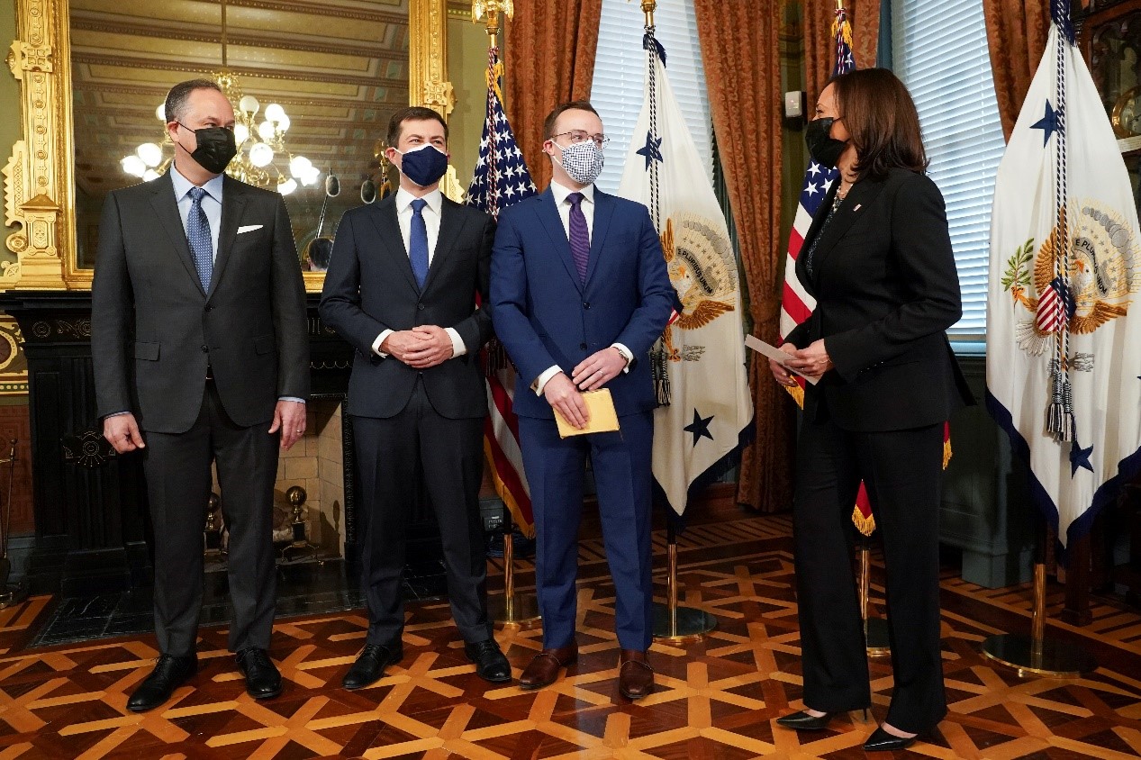 當地時間2月3日,在美國華盛頓白宮,新任交通部長布提吉格在美國副總統賀錦麗的見證下宣誓就職。為布提吉格手捧《聖經》的是他的丈夫查斯滕。布提吉格是美國歷史上第一位公開同性戀身份的內閣成員。