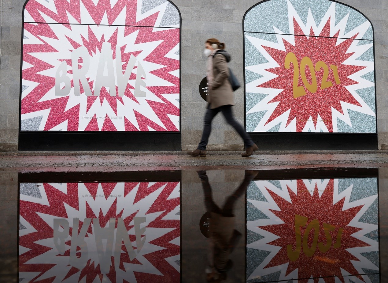 當地時間2月3日,德國柏林一家百貨公司的窗戶倒映在水中。因疫情封禁關係,路上行人不多。