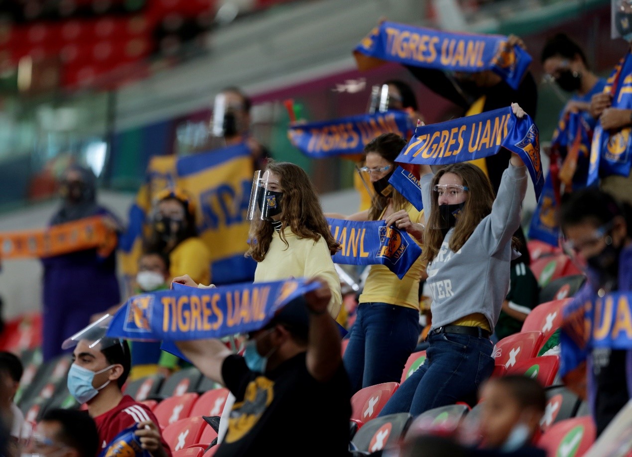 當地時間2月3日,在卡塔爾首都多哈,球迷戴口罩觀看國際足聯俱樂部世界盃。