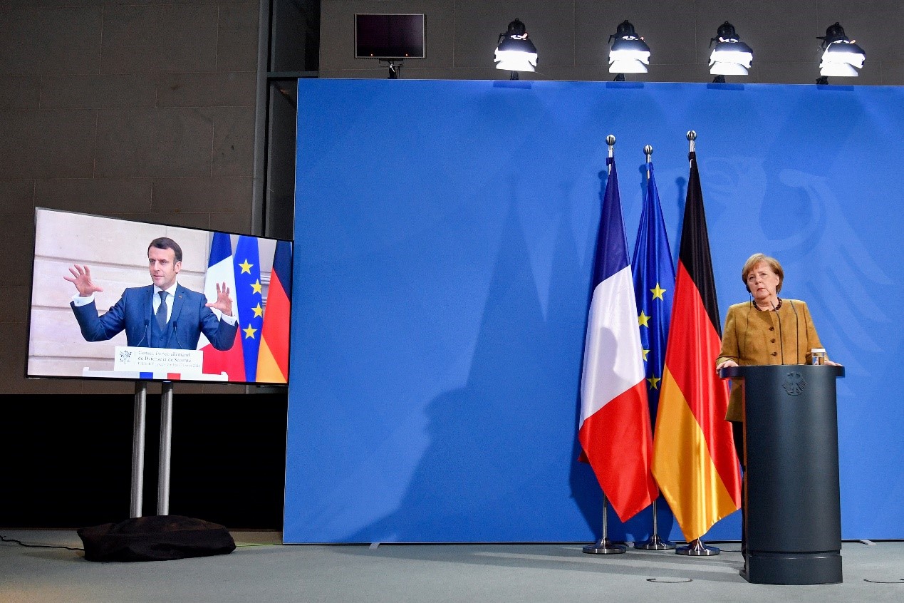 當地時間2月5日,德國柏林,德國總理默克爾和法國總統馬克龍在德法安全理事會視頻會談後舉行新聞發布會。