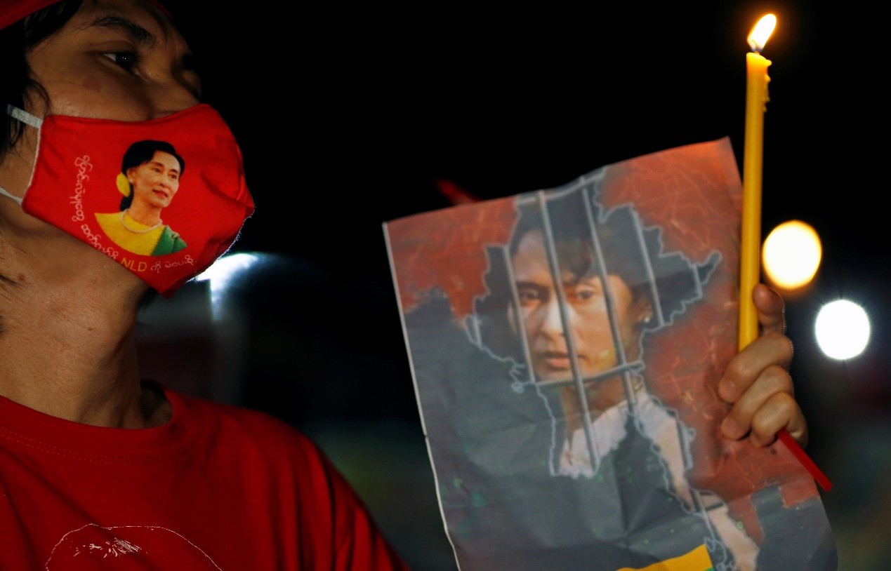 當地時間2月6日,在泰國曼谷的聯合國會場外,一名民眾手持蠟燭和緬甸國務資政昂山素姬的照片,抗議緬甸軍事政變。