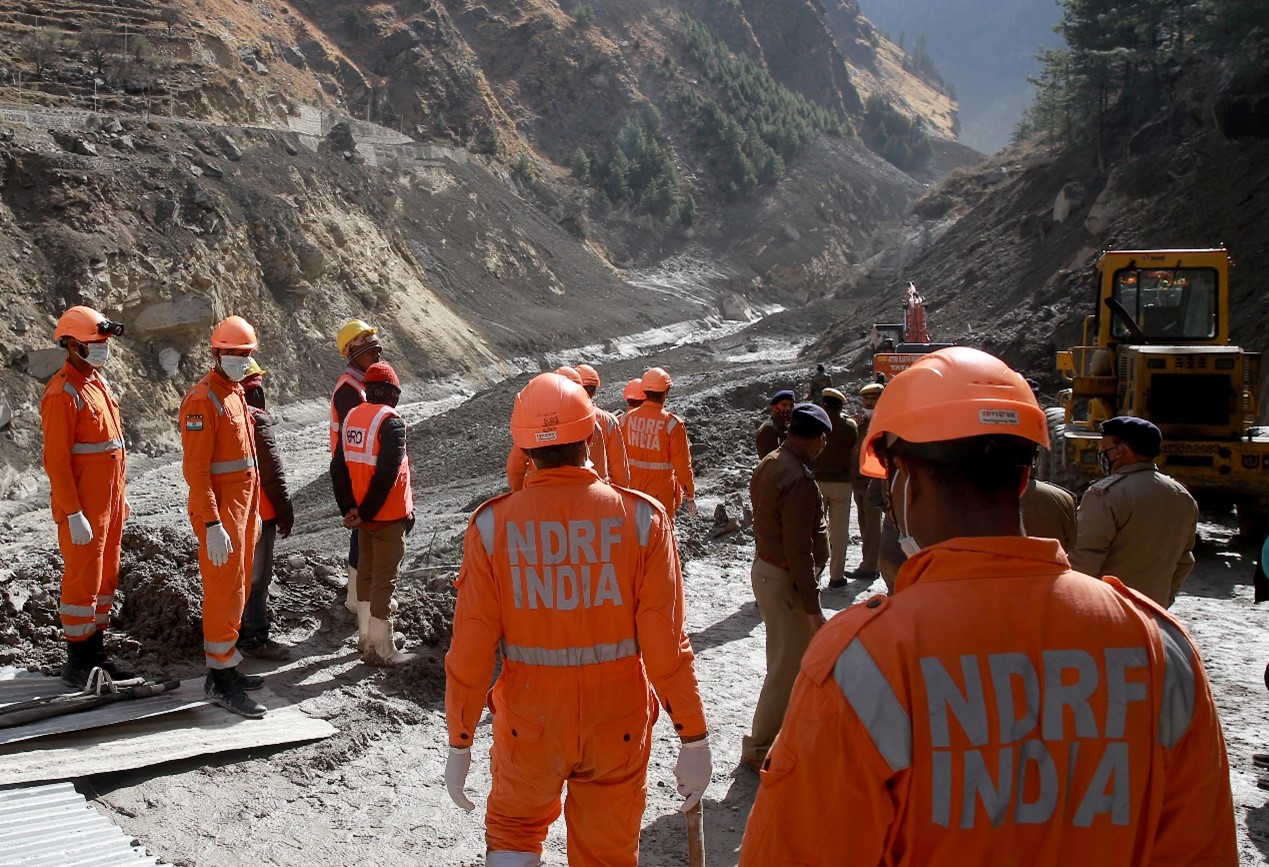 當地時間2月9日,在印度北部的阿肯德邦,國家救災部隊成員在冰川部分斷裂的隧道外進行救援行動。阿肯德邦7日上午發生冰川斷裂,斷裂的冰川墜入陶利根加河後導致河流決堤並引發洪水,造成多人傷亡。(編譯:徐浩 圖源:路透社)