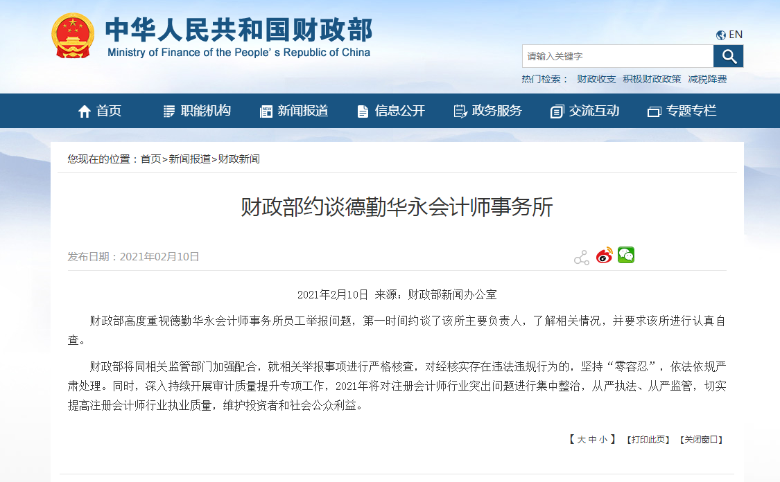 財政部高度重視德勤華永會計師事務所員工舉報問題,第一時間約談了該所主要負責人,了解相關情況,並要求該所進行認真自查。