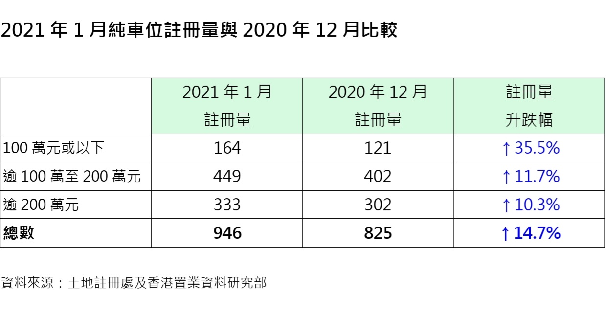 若以金額來劃分純車位註冊量,價值100萬元或以下,1月錄錄164宗,較去年12月的121宗增加約35.5%。價值100萬元以上至200萬元,1月錄449宗,較去年12月的402宗增加約11.7%。價值200萬元以上,1月錄333宗,較去年12月的302宗增加約10.3%。鑑於簽署買賣合約至遞交到土地註冊處註冊登記需時,1月註冊個案一般主要反映去年12月市況。