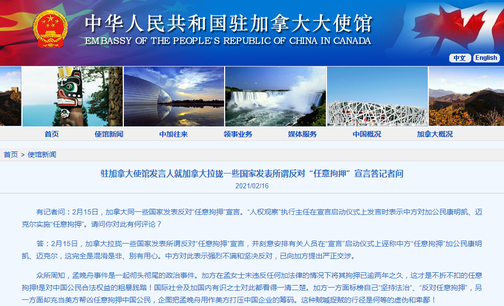 2月15日,加拿大同一些國家發表反對「任意拘押」宣言。对此,中國駐加拿大大使館2月16日在官方网站刊文表示,加方一方面標榜自己「堅持法治」、「反對任意拘押」,另一方面卻充當美方幫兇任意拘押中國公民,企圖把孟晚舟用作美方打壓中國企業的籌碼。這種賊喊捉賊的行徑是何等的虛偽和卑鄙!