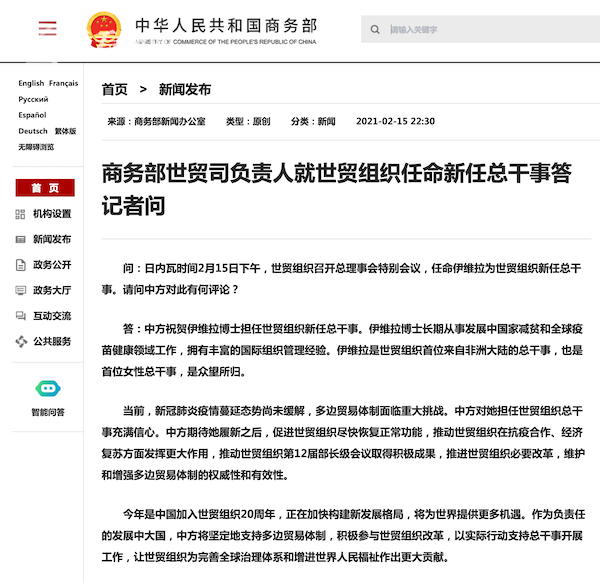 日內瓦時間2月15日下午,世貿組織召開總理事會特別會議,任命伊維拉為世貿組織新任總幹事。對此,商務部回應表示,伊維拉是世貿組織首位來自非洲大陸的總幹事,也是首位女性總幹事,是眾望所歸。中方期待她履新之後,促進世貿組織儘快恢復正常功能,推動世貿組織在抗疫合作、經濟復蘇方面發揮更大作用。