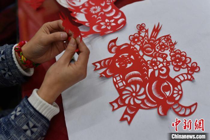 民間剪紙藝人正在創作牛年生肖剪紙。