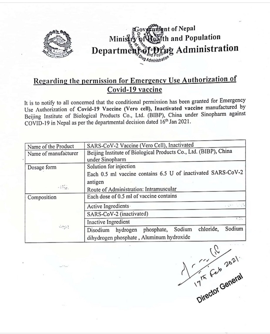 根據該公告,尼泊爾本次批准緊急使用的是國藥集團北京生物製品研究室生產的新型冠狀病毒肺炎滅活疫苗。