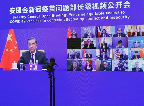 國務委員兼外長王毅2021年2月17日在北京以視頻方式出席聯合國安理會新冠疫苗問題部長級公開會,並發表題為《以人民為中心加強全球抗疫合作》的講話。