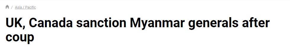 綜合外媒18日消息,英國和加拿大先後宣布制裁緬甸軍方將領,要求他們為發動政變負責。