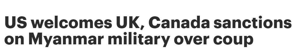 美國國務卿布林肯在推特上表示:「美國歡迎英國和加拿大對應對緬甸政變的負責人實施制裁。」「我們敦促國際社會發出統一的信息以促進問責。緬甸軍隊必須恢復民主選舉產生的政府。」