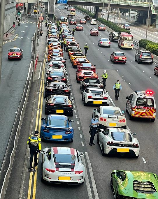 今晨(21日)45輛包括林寶堅尼和法拉利等超級跑車在港島東區走廊飛馳,引掣巨響引起市民留意,警方接報在灣仔告士打道將「車隊」截停,其中一輛跑車涉非法改裝,另有9輛車司機收欠妥車輛報告,過程被市民吸引大批市民圍觀,形容像:「香港格蘭披治大賽。」