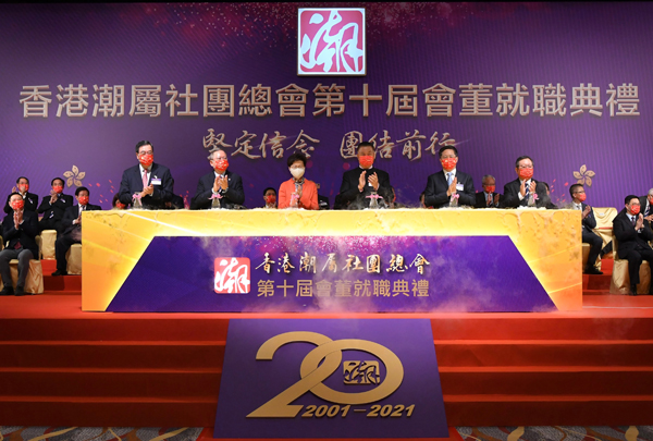 林鄭月娥表示,總會成立20年來,一直致力發揚愛國愛港精神,凝聚潮籍鄉親的力量,加強屬會間的聯繫,團結各行各業的精英翹楚,建設香港,貢獻國家,並對潮港兩地的建設和發展貢獻良多。過去一年,香港局面隨着香港國安法實施由亂向治,但同時和世界各地一樣,飽受新冠疫情衝擊。總會全力支持香港國安法,支持特區政府依法維護國家安全,支持香港警隊堅定執法;在抗疫方面,總會關懷社群,充分發揮潮籍人士團結互助的精神,為有需要的人伸出援手,例如向市民免費派發抗疫物資、贈送平板電腦給基層學童等。無論在抗暴和抗疫方面,總會都是政府的堅實夥伴,她對總會的支持表示衷心感謝。她相信新一屆會董定會承先啟後,繼續與政府攜手協力,一起為香港和家鄉的繁榮安定作出貢獻。