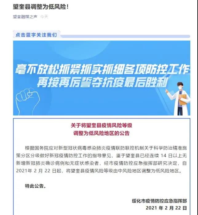 據望奎融媒之聲微信公眾號消息,綏化市疫情防控應急指揮部發布關於將望奎縣疫情風險等級調整為低風險地區的公告。根據國務院應對新型冠狀病毒感染肺炎疫情聯防聯控機制關於科學防治精準施策分區分級做好新冠疫情防控工作的指導意見,鑑於黑龍江綏化望奎縣已經連續14日以上無新增新冠肺炎確診病例和無症狀感染者,經綏化市疫情防控應急指揮部研究決定,自2021年2月22日起,將望奎縣疫情風險等級由中風險地區調整為低風險地區。