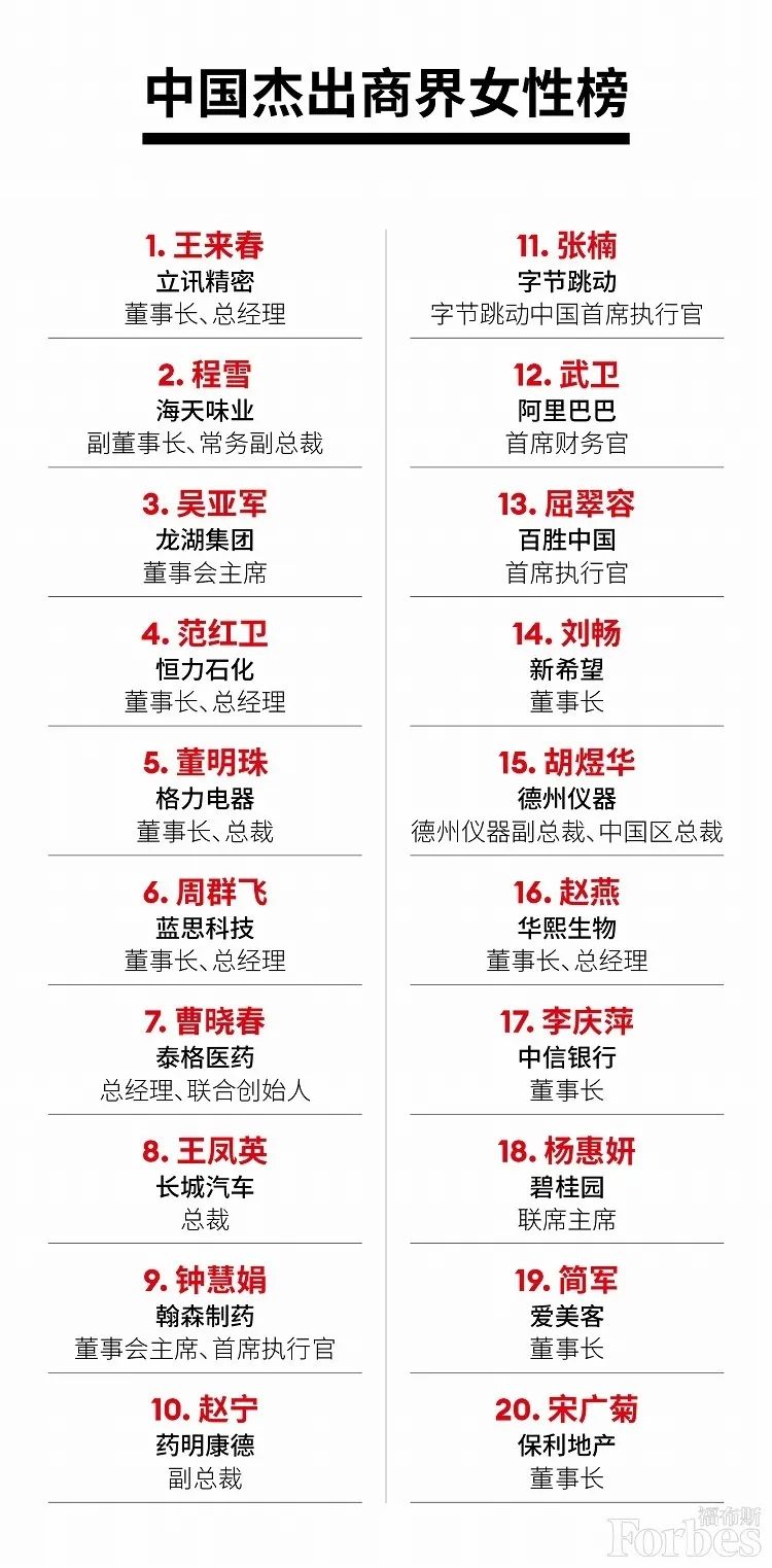 據中新經緯消息,2月22日,福布斯中國當日發布2021年度中國傑出商界女性榜,立訊精密董事長王來春居榜首,董明珠位居第五。