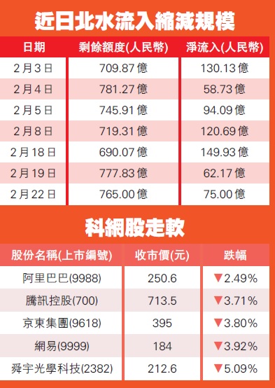 南下資金22日淨流入港股約75億元,市場擔心流入規模有所縮減。農曆年假關係,港股通暫停,直至上周四(18日)重開,北水錄得逾149億,翌日流入規模減少至約62億,即農曆年後三個交易日,已經連續兩日北水規模持續低於100億。