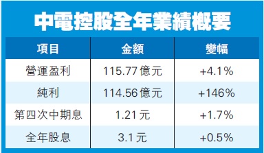 期內,中電控股的營運盈利按年增長4.1%至115.77億元,派第四次中期息每股1.21元,全年派息合共3.1元。其中,香港電力業務盈利按年增長5%至78.18億元;但印度業務則因為去年當地夏季季候風不穩定,拖累該分部盈利按年急跌33.5%至1.75億元。