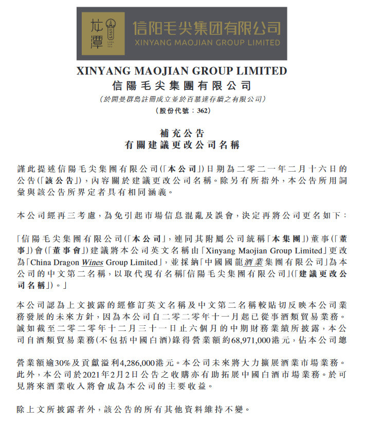 信陽毛尖2月22日晚間公告,經再三考慮,為免引起市場信息混亂及誤會,決定再將公司更名如下:將公司英文名稱由「Xinyang Maojian Group Limited」更改為「China Dragon Wines Group Limited」,並採納「中國國龍酒業集團有限公司」為公司的中文第二名稱。