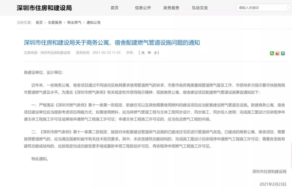 2月23日,深圳市住建局發布《關於商務公寓、宿舍配建燃氣管道設施問題的通知》,對商務公寓、宿舍配建燃氣管道設施作出進一步明確。新建住宅以及其他需要使用燃料的建設項目應當配套建設燃氣管道及設施;鼓勵對未配套建設管道供氣設施的已建成住宅區進行管道供氣改造。已建成的商務公寓、宿舍項目,需要使用管道燃氣的,應當滿足國家和省市有關技術規範要求。