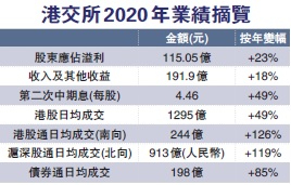 去年股市日均成交創新高,加上生物科技公司及中概股上市,期內港交所賺115.05億元,按年升23%,略勝預期,並連續3年盈利創歷史新高。不過,適逢港府公布上調股票印花稅,港交所股價昨日(23日)仍跌逾8%。展望前景,港交所表示樂觀。