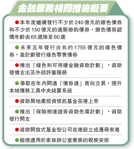 .本年度繼續發行不少於240億元的銀色債券和不少於150億元的通脹掛鉤債券,銀色債券認購年齡由65歲降至60歲