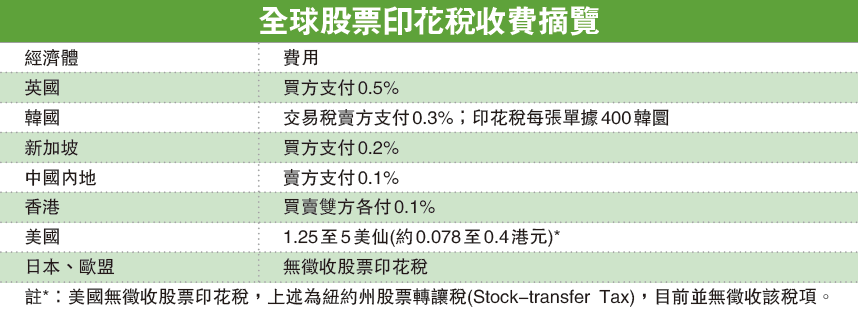 縱觀全球股票市場的印花稅,本港的稅率並非最高。例如新加坡稅率為0.2%,英國更高達0.5%,部分中小型股票則可獲豁免。美國聯邦政府則無徵收股票印花稅,紐約交易所和納斯達克交易所所在的紐約州,雖設有按每股價格徵收的股票轉讓稅,不過自1981年起已全面退稅,變相不用繳稅。至於內地,僅須賣方支付0.1%。