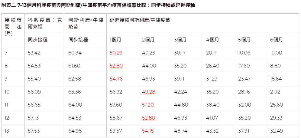研究人員還比較7至13個月期間科興疫苗與阿斯利康/牛津疫苗平均疫苗保護率。當兩種新冠肺炎疫苗同步接種,阿斯利康/牛津疫苗的平均疫苗保護率高於科興疫苗;在疫苗接種半年內,科興疫苗與阿斯利康/牛津疫苗的平均疫苗保護率分別為53.42%和60.34%;若延遲接種阿斯利康/牛津疫苗1個月,最終會令首7個月的平均疫苗保護率減少到50.29%,低於在第一個月接種科興疫苗的平均疫苗保護率53.42%;同步接種兩款新冠肺炎疫苗,在疫苗接種1年內,科興疫苗與阿斯利康/牛津疫苗的平均疫苗保護率分別為57.53%和64.98%;假若延遲接種阿斯利康/牛津疫苗兩個月,首13個月的平均疫苗保護率即減少到54.15%,低於在第一個月接種科興疫苗的平均疫苗保護率57.53%。