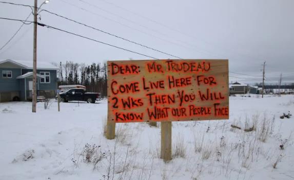 第一民族保留區樹立的牌子,上面的文字是「親愛的杜魯多先生,來這裏生活兩個星期,你才能知道我們面臨什麼問題」。