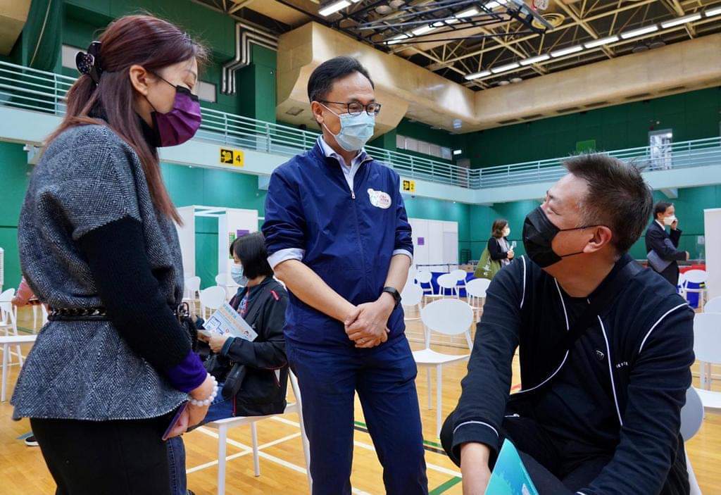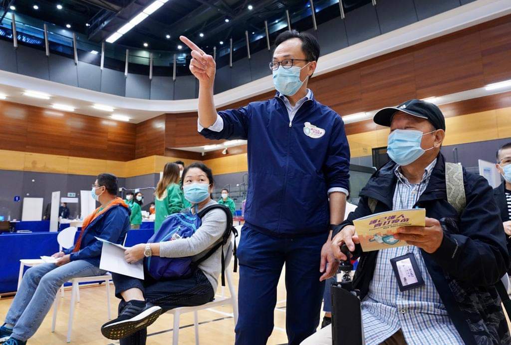 科興疫苗接種第二天,公務員事務局局長聶德權分別到了天水圍天暉路體育館及沙田源禾路體育館兩間疫苗接種中心,視察接種及運作情況。他現兩個場館均運作暢順,市民一般都能夠在一小時內完成整個接種過程。