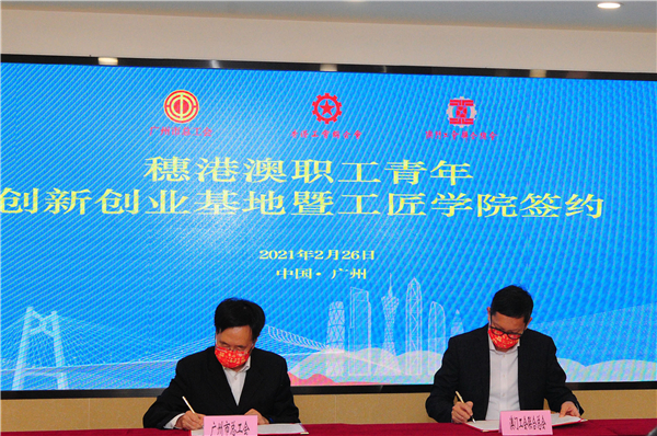 27日,記者從廣州市總工會獲悉,由廣州市總工會、香港工會聯合會、澳門工會聯合總會合作的穗港澳職工青年創新創業基地暨工匠學院(簡稱「雙創基地」)簽約及揭牌2月26日在廣州市舉行,香港工會聯合會設香港分會場,線上同步進行。