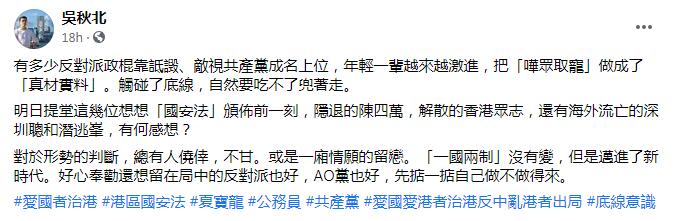 港區全國人大代表、工聯會會長吴秋北昨日(2月28日)在社交平台发文指,有年輕一輩越來越激進,把「嘩眾取寵」做成了「真材實料」。觸碰了底線,自然要吃不了兜著走。「一國兩制」沒有變,但是邁進了新時代。好心奉勸還想留在局中的反對派也好,AO黨也好,先掂一掂自己做不做得來。