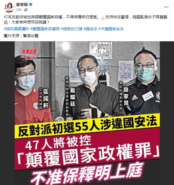 议员麦美娟亦在社交平台发文表示,搞初选真揽炒,支持依法審理,禍國亂港份子罪責難逃。