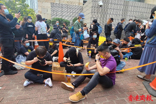 工作人員拿出告示通知現場人士,预留位置已满,已經沒有辦法進法庭旁聽。休庭期間,有人繼續在現場排隊,席地吃飯。