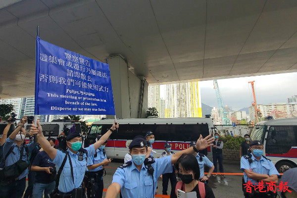 有網紅到場直播,場面一度混亂,警方出示藍旗及紫旗警告。(记者 木子 冯瀚文)