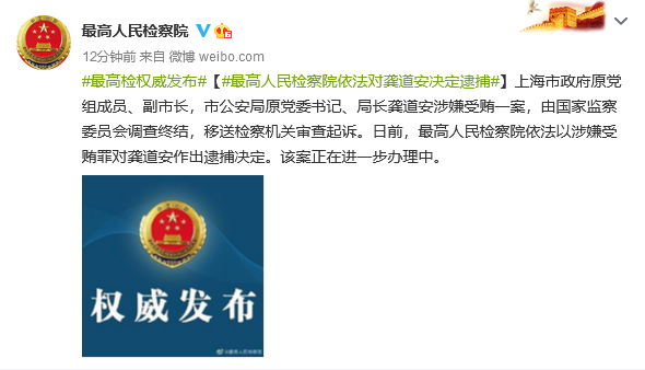 據最高人民檢察院微博消息,上海市政府原黨組成員、副市長,市公安局原黨委書記、局長龔道安涉嫌受賄一案,由國家監察委員會調查終結,移送檢察機關審查起訴。日前,最高人民檢察院 依法以涉嫌受賄罪對龔道安作出逮捕決定。該案正在進一步辦理中。