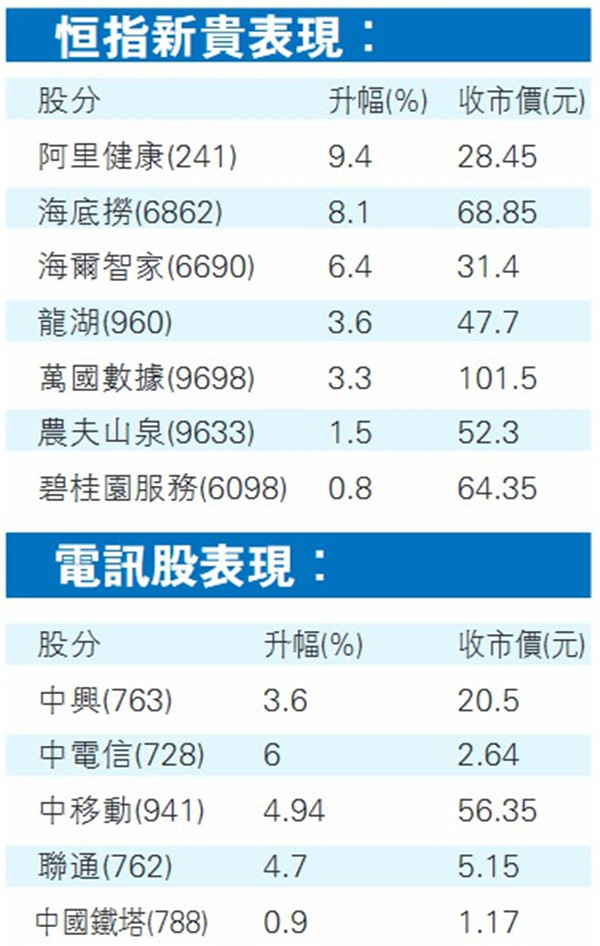 綜觀港股,資金流入藍籌新貴,阿里健康(241)、海底撈(6862)及龍湖(960)全日分別升9.4%、8.2%和3.7%。碧桂園服務(6098)及農夫山泉(9633)獲納入國指成分股,全日分別升0.9%及1.6%。海爾智家(6690)及萬國數據(9698)納入恒生科技指數,收市分別升6.4%和3.4%。港交所(388)昨亦反彈3.4%。工信部稱國家支持晶片產業,華虹半導體(1347)升近11%,中芯國際(981)升6%。