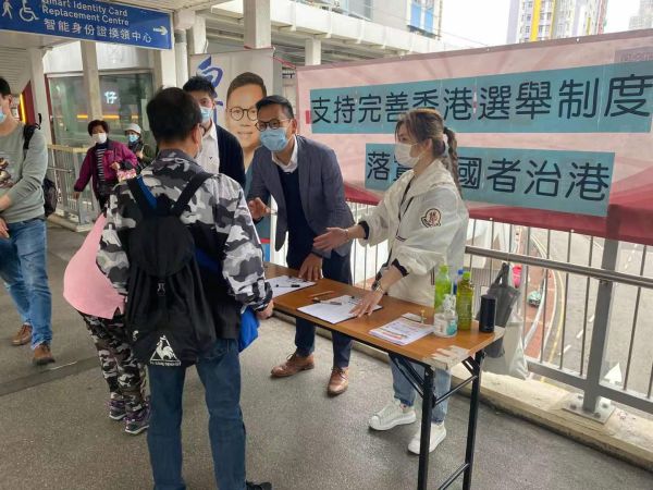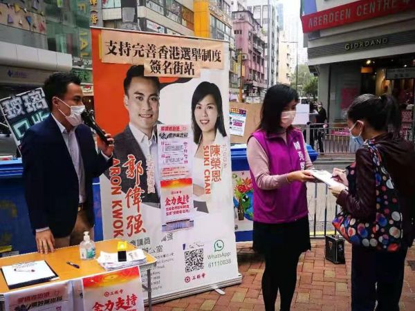 工聯會透露,「支持全國人大完善香港選舉制度 落實愛國者治港」簽名行動由即日(5日)起,一連3天在全港多區設置街站接受市民簽名,工聯會期望市民一同發聲支持完善香港特區的選舉制度,讓社會得以繼續向前發展。(顶图为工聯會副會長唐賡堯,副理事長謝愛紅及九龍東總幹事鄧家彪等在街站收集簽名)