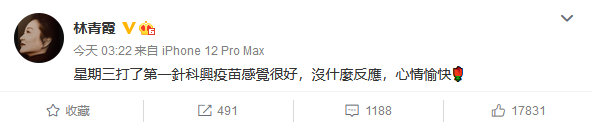 林青霞在文中稱:「星期三打了第一針科興疫苗感覺很好,沒什麼反應,心情愉快。」
