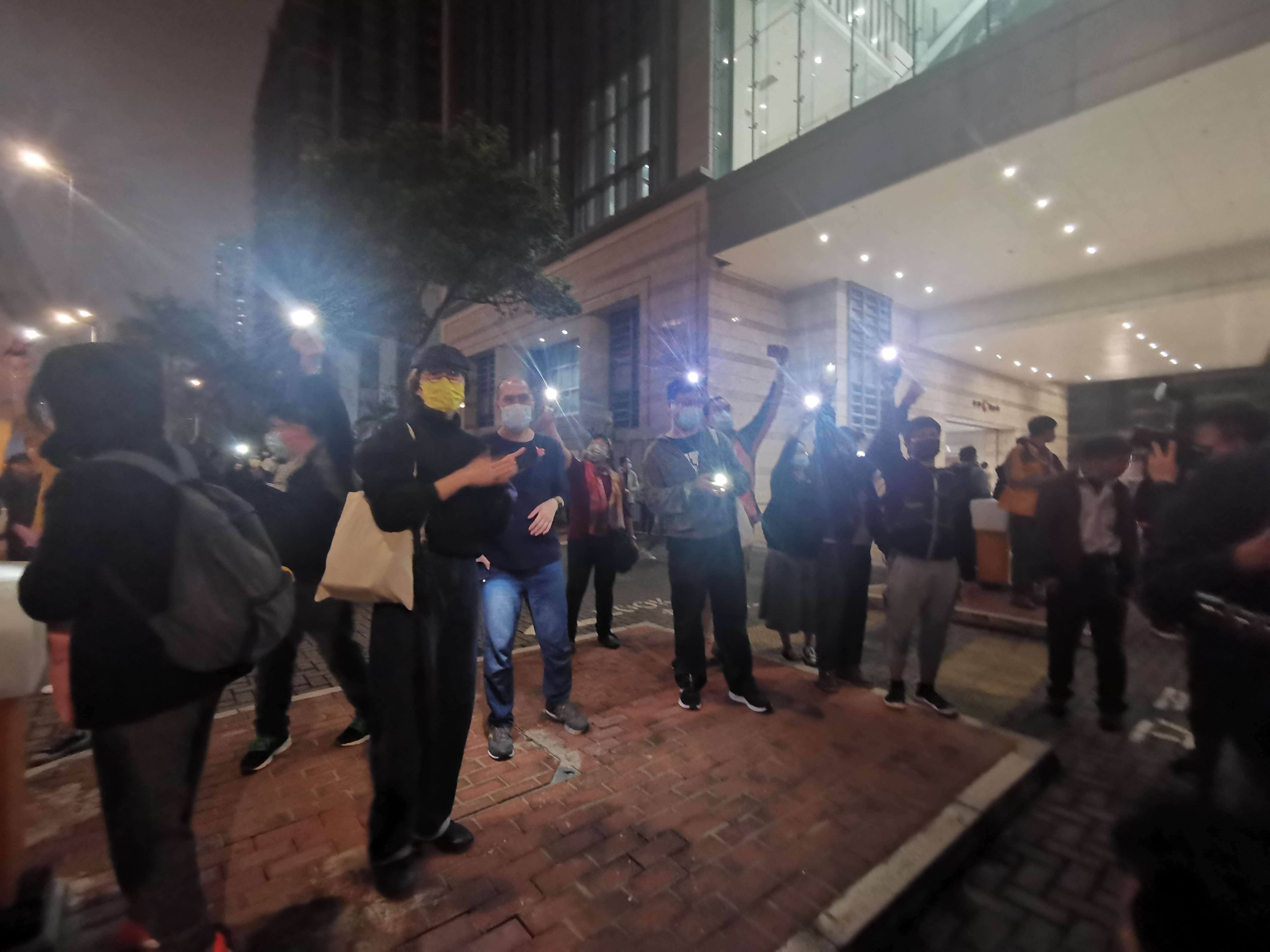 法院外面有幾十名黑衣人高舉着手機的電筒大喊加油,每一盞燈的背後可能就是一個家庭,這些被告們,面對這份支持和信任,帶給這些家庭的是幸福的呼喚,還是不負責任的煽動?
