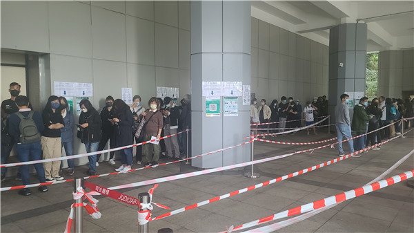 庭外有大批人群聚集,有人甚至從昨天晚上10點就開始在外排隊,由於現場人數眾多,警方派出大批人員在現場戒備,在午飯前啟用599G,要求不能進場旁聽的市民和平散去。