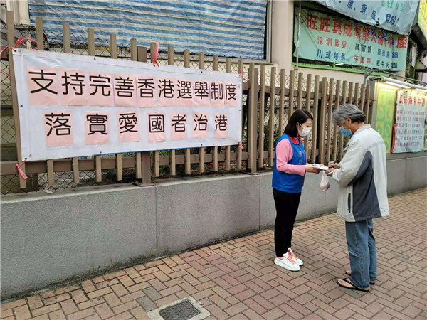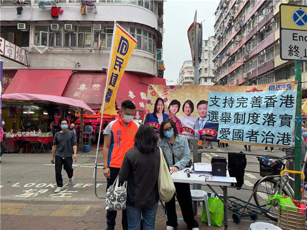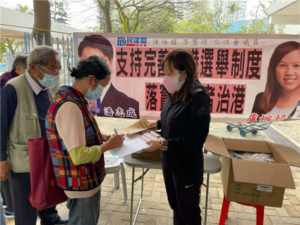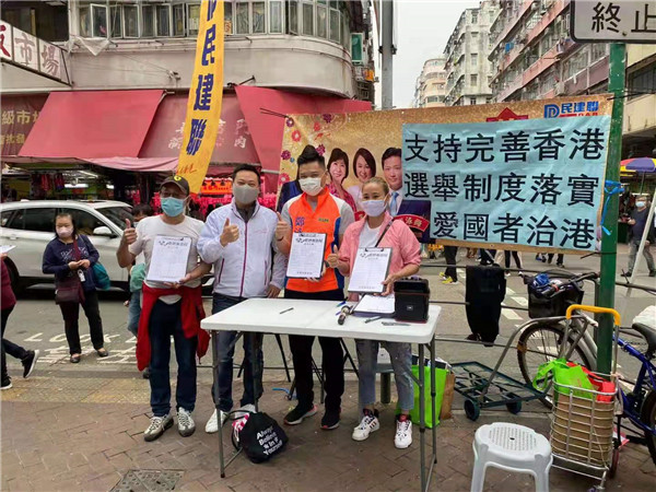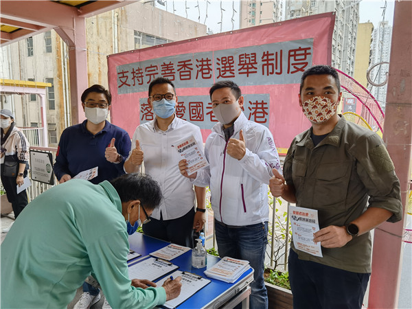 3月6日,大埔西貢景林溫啟明、葛珮帆開展「支持完善香港選舉制度,愛國者治港」簽名。