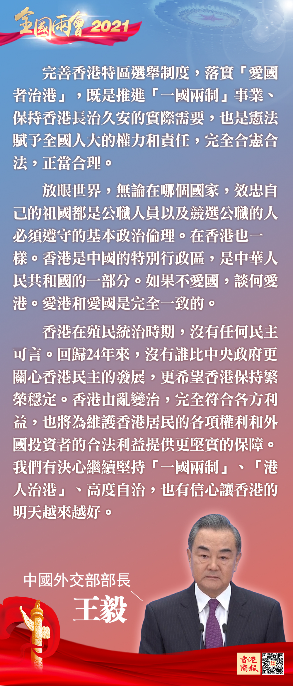 昨日(7日),國務委員兼外交部長王毅在兩會記者會上應詢就全國人大將就完善香港特區選舉制度作出決定表明立場。他說,完善香港特區選舉制度,落實「愛國者治港」,既是推進「一國兩制」事業、保持香港長治久安的實際需要,也是憲法賦予全國人大的權力和責任,完全合憲合法,正當合理。